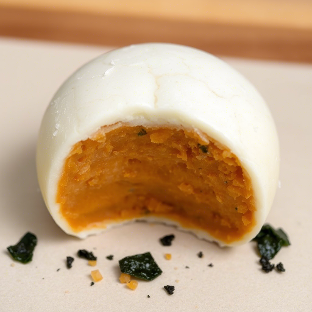 - Вода — 270 г - Сахар — 150 г - Рисовая мука (с повышенной клейковиной) — 150 г - Кукурузный крахмал — для работы с тестом - Нори (водоросли) — 1–2 листа для украшения - Карамельный шоколад — 300 г - Какао-масло — 60 г - Сливки 33–35% — 240 г - Мед — 45 г - Соевый соус — 45 г - Сливочное масло — 60 г - Стручок ванили — 1 шт. - Сотейник, силиконовые формы для начинки, погружной блендер, сито, микроволновка, силиконовый коврик, пищевая пленка, кондитерский мешок. 1. Влейте сливки в сотейник. 2. Разрежьте стручок ванили вдоль, соскребите ножом семена и добавьте их в сливки вместе с пустым стручком. 3. Доведите смесь до температуры 80–85°C (появится пар, но кипения быть не должно). 4. Снимите с огня, накройте фольгой и оставьте на 30 минут для раскрытия аромата. 1. Процедите сливки через сито, удалив ваниль. 2. Добавьте в них мед и соевый соус, перемешайте. 3. Снова нагрейте смесь до 80–85°C, не допуская кипения. 1. Поломайте карамельный шоколад н