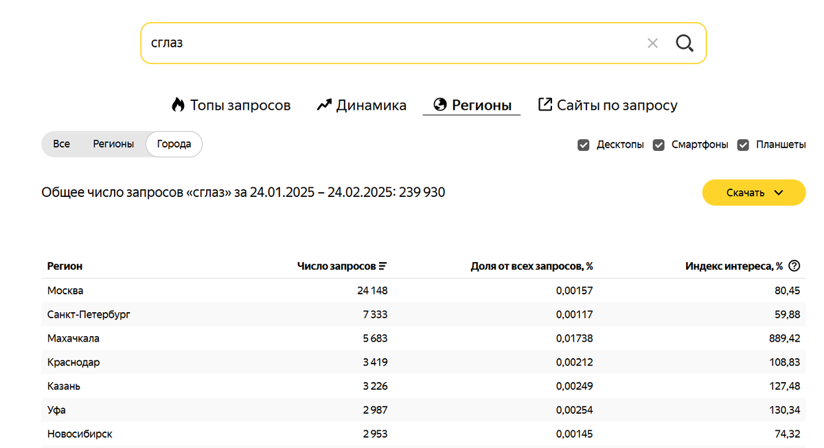 Если обратится к сервису вордстат в «Яндексе», можно проследить количество запросов по ключевым словам и регионы, где эти запросы были произведены. Вопреки распространенному мнению, что в сглаз и порчу верят малообразованные жители деревень, статистика показывает, что соответствующие поисковые запросы свойственны и жителям мегаполисов, и центральных регионов страны.