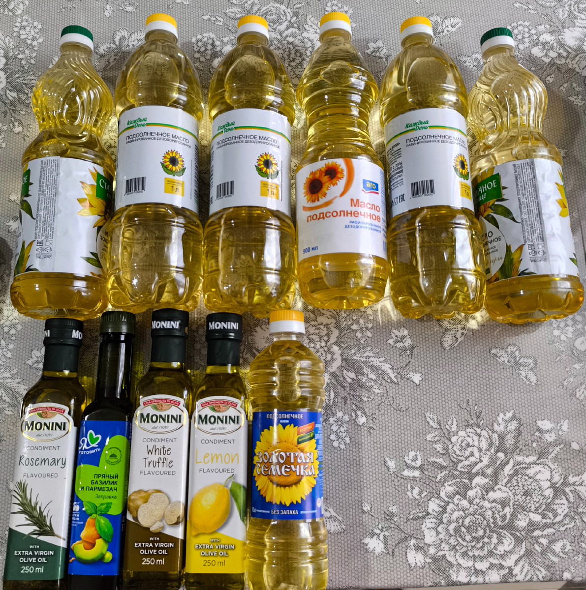 Наконец-то запасы этой категории меня начинают радовать. Избавились от всего лишнего и не очень вкусного за зиму. И нет, не выкинули, просто нашли съедобные рецепты. Помните анекдот про кошек? "Вы любите кошек? - Нет, - Вы просто не умеете их готовить!" В целом нет не вкусных продуктов, просто нужно найти к ним подход! С этим самым подходом я научилась варить полезный рис - бурый, рубин и т.д. Но так как супруг очень бурно протестует против этих видов риса, покупать больше не буду. Свое предпочтение отдали обычному круглозерному, рису Жасмин и Басматти. Последние два сорта идеальны на гарнир. Очень ароматные, рассыпчатые и варятся без танцев с бубнами. После экспериментов с рисом меня потянуло на полезную муку, рисовую уже наши организмы доели и сделали вывод - не наш продукт однозначно. Не поняли в чем там польза, вкуса тоже особо нет, а танцев с бубнами много. Муки сортов полезных и не очень много, так что экспериментировать будем как минимум до лета. 1. Растительное масло. Тут все в