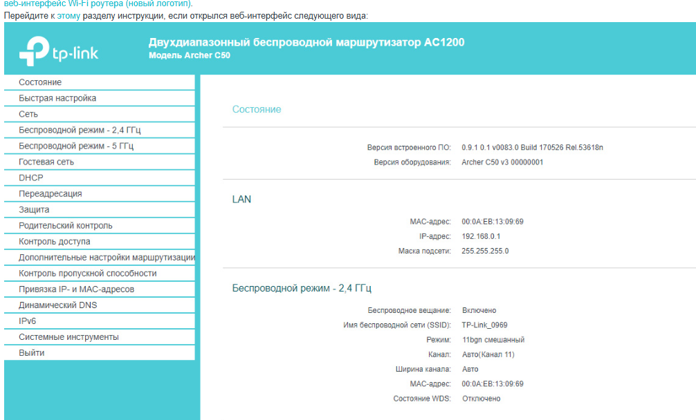 - Перейдите в раздел «Состояние» и найдите подраздел «Беспроводной режим – 2,4 ГГц».