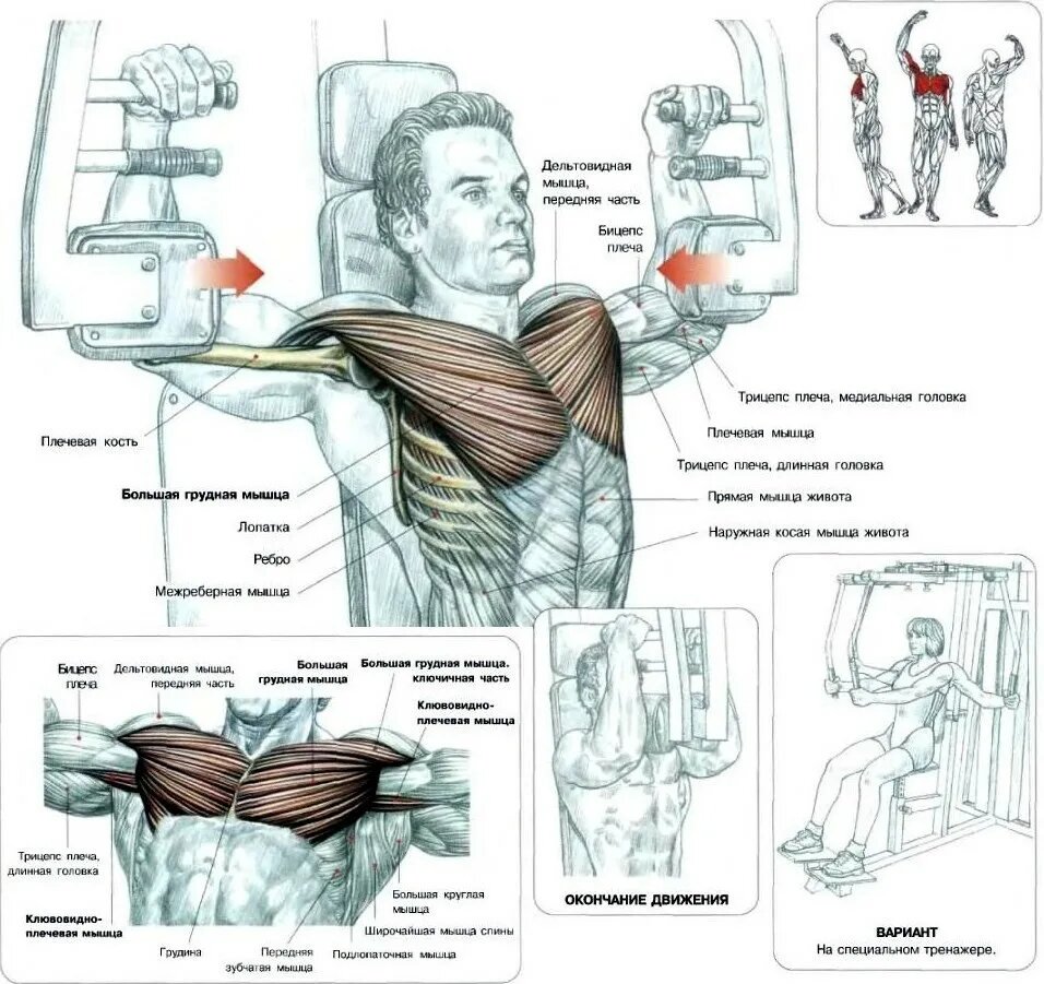 Ранее мы уже говорили о тренировки грудных мышц, в первой части говорили об упражнениях со штангой. Смотрите статью: Я всегда начинал тренировку со штангой, потом переходил к гантелям, и потом добивался в тренажерах – так называемая третья фаза. Сегодня речь пойдет об упражнениях в тренажерах. Упражнения с гантелями полностью повторяют упражнения со штангой. Кроме одного: разводка гантелей – его мы сегодня разберем. Упражнения в тренажерах позволяют точечно воздействовать на мышцу, проработать ее детально. Главный плюс упражнений в тренажерах — это минимизация травм. Так же стоить отметить это не силовое упражнение, поэтому о большом весе и разовых повторениях можно забыть сразу. Главный принцип — объём нагрузки, направленный точно в грудную мышцу. 4 рекомендации для более качественного выполнения упр: В конечной точке грудные мышцы нужно сжимать как можно сильнее, чтобы усилить пиковое сокращение При разведении рук необходимо сопротивляться обратной тяге, придерживая рукояти усилием м