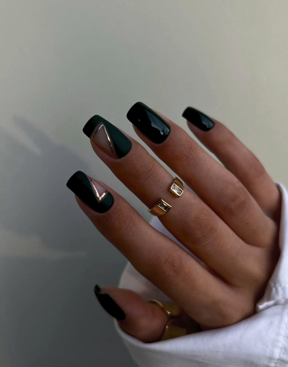✅ Покройте ногти глубоким зелёным гель-лаком в два слоя, но оставьте пару прозрачных участков для акцентов.
