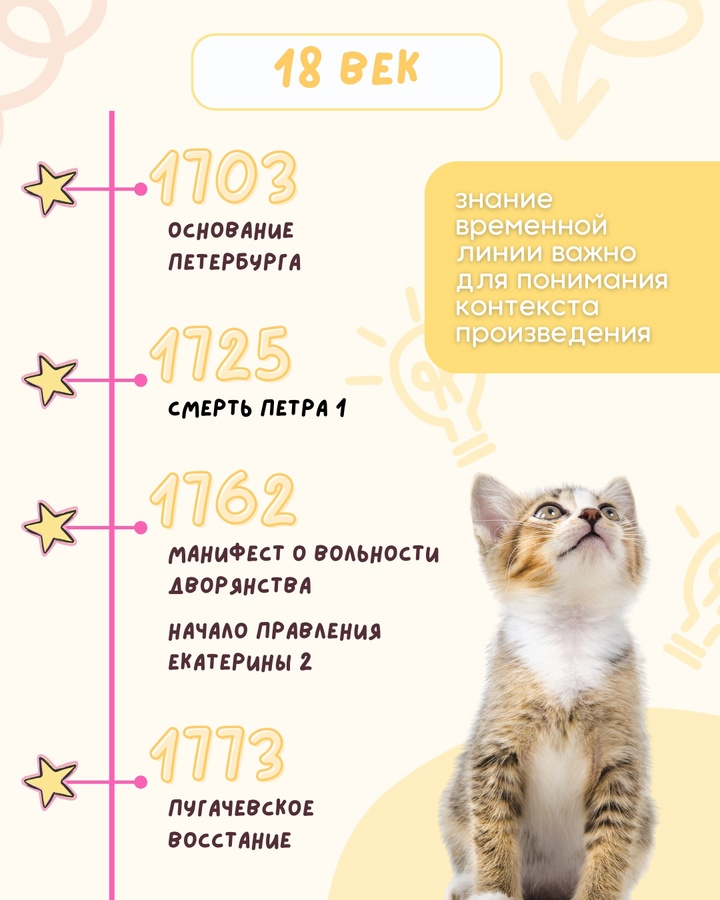 Но важно: — Знать, в какие периоды были написаны произведения - на экзамене вас могут попросить привести примеры, относящиеся к определенным векам😼 — Разбираться во временной линии и ориентироваться в основных событиях истории страны👀 Важно понимать, например, что поэма "Кому на Руси жить хорошо" написана спустя 2 года после отмены крепостного права, а "Реквием" Анны Ахматовой описывает события большого террора! Для этого собрали шпаргалку по важным датам💛 Листай карусель и обязательно сохрани себе!