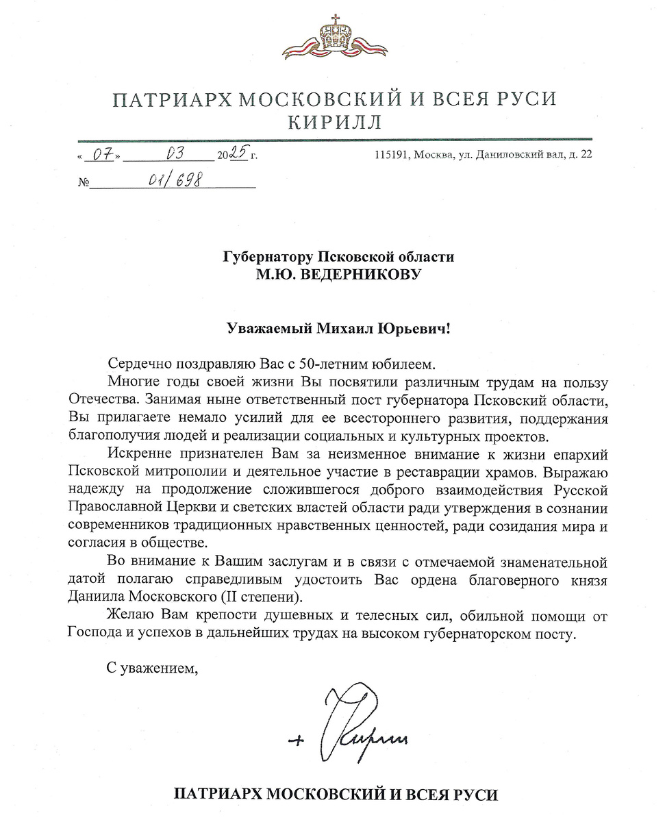 7 марта 2025 года Святейший Патриарх Московский и всея Руси Кирилл поздравил губернатора Псковской области Михаила Юрьевича Ведерникова с 50-летием со дня рождения. Губернатору Псковской области М.Ю. Ведерникову Уважаемый Михаил Юрьевич! Сердечно поздравляю Вас с 50-летним юбилеем. Многие годы своей жизни Вы посвятили различным трудам на пользу Отечества. Занимая ныне ответственный пост губернатора Псковский области, Вы прилагаете немало усилий для ее всестороннего развития, поддержания благополучия людей и реализации социальных и культурных проектов. Искренне признателен Вам за неизменное внимание к жизни епархий Псковской митрополии и деятельное участие в реставрации храмов. Выражаю надежду на продолжение сложившегося доброго взаимодействия Русской Православной Церкви и светских властей области ради утверждения в сознании современников традиционных нравственных ценностей, ради созидания мира и согласия в обществе. Во внимание к Вашим заслугам и в связи с отмечаемой знаменательной да