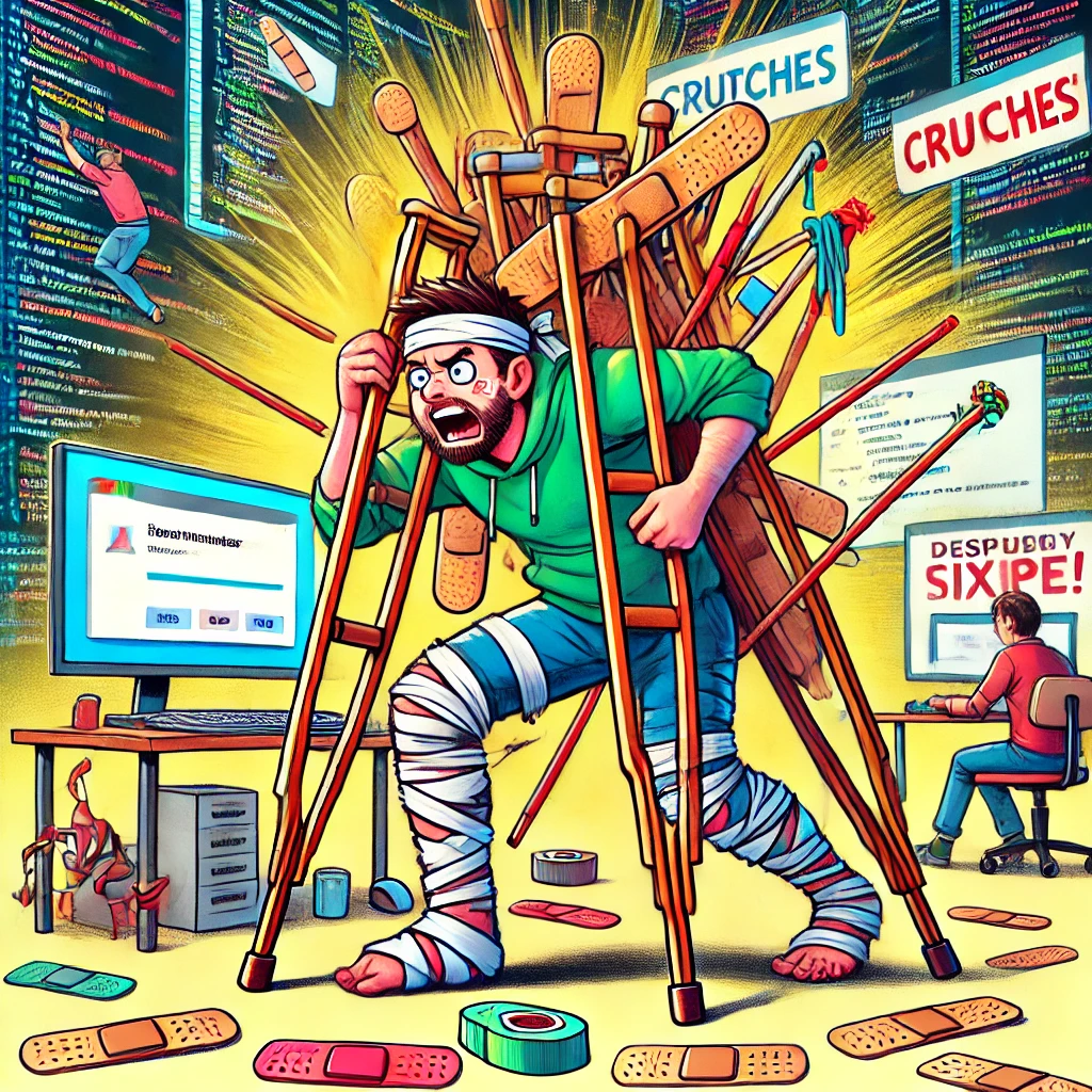 В программировании "костыль" (workaround) — это временное или не самое элегантное решение проблемы, применяемое, когда более правильный способ реализации невозможен, слишком сложен или требует слишком много времени. Хотя термин часто используется с негативным оттенком, в реальной практике без костылей не обходится ни один проект. Почему приходится использовать костыли? Иногда используемый язык программирования, библиотека или фреймворк просто не поддерживают нужный функционал. Например, в старых версиях браузеров не было flexbox и grid, и разработчикам приходилось использовать таблицы для верстки или хаки с float. В реальных проектах время всегда ограничено. Если на продакшн-сервере внезапно появляется критический баг, его нужно исправить максимально быстро, пусть даже не самым красивым способом. Потом можно будет вернуться и рефакторить. Часто программистам приходится работать с кодом, который писали другие люди, возможно, много лет назад. Если этот код плохо документирован или слишко