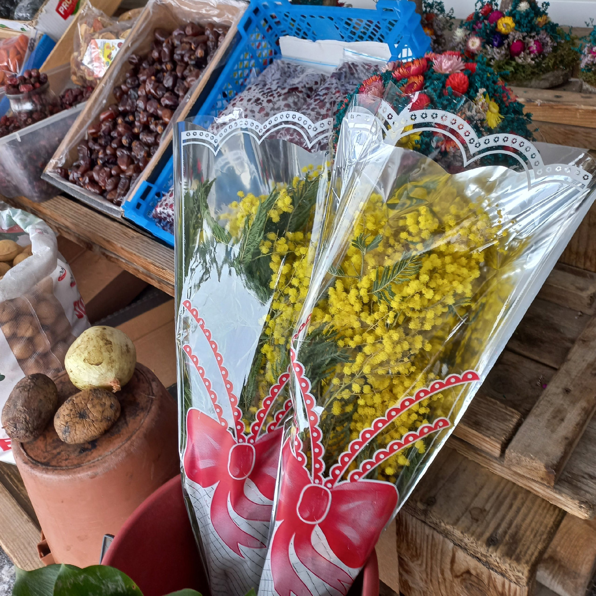 Предпраздничные рынки. Ооо, это отельная песня. Букеты и рядом редька, видели такое? А оно есть. Мимозы в этом году мало. Цена за букетик 300 рублей. В букетике две веточки. Откуда у нас мимоза? Везут с Абхазии. Привозят в полосатых баулах. Продают оптом по 20 руб за веточку.