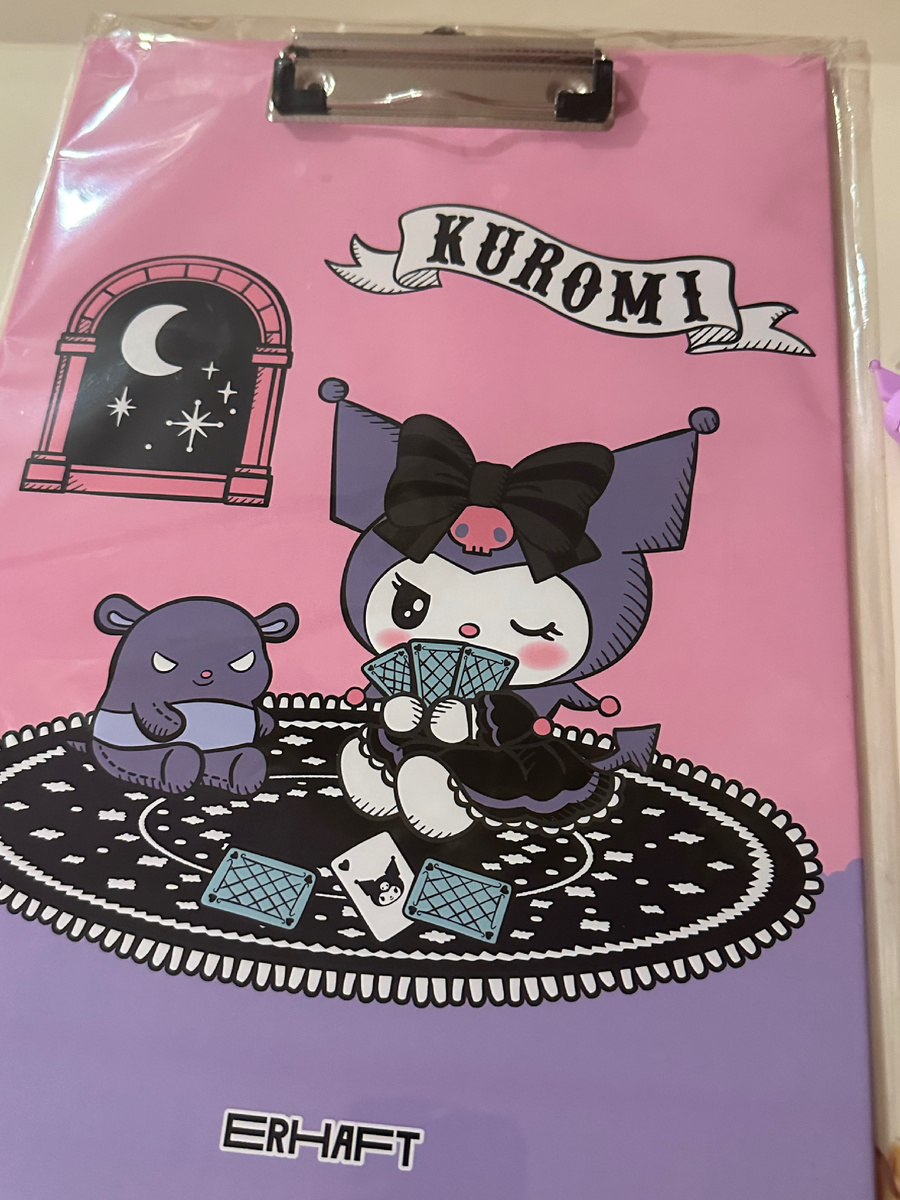 Всем привет! Я- Крошка Президент! В моём блоге про учёбу в Южной Корее, корейском языке и милых трендах. Сегодня будем обозревать с вами мои покупочки в Детском мире. Еще в октябре 2024 году я обнаружила, что в Детский мир привезли коллекцию Kuromi от бренда Erhaft. Что примечательно: в приложении делаются приятные скидки на продукцию, поэтому попросить кассира пробить товар по цене из онлайн-приложения. (И нет, это не реклама, а вот бы какой-нибудь бренд предложил мне её, эххх:(((() Я, разумеется, воспользовалась этой возможностью и от жадности взяла себе всяких мелочей, радующих глазки. Примечательно, что производитель выпустил данный товар в двух цветах. Черный для вечернего коктейльного платья, а фиолетовый- для задорных девчонок, желающих выделиться на мероприятии при декламации стихотворений. Планшеты с зажимами всегда были недешевым удовольствием и в моём детстве их производство было не так распространено. Поэтому за планшетом с зажимом приходилось ходить на поиски в книжн