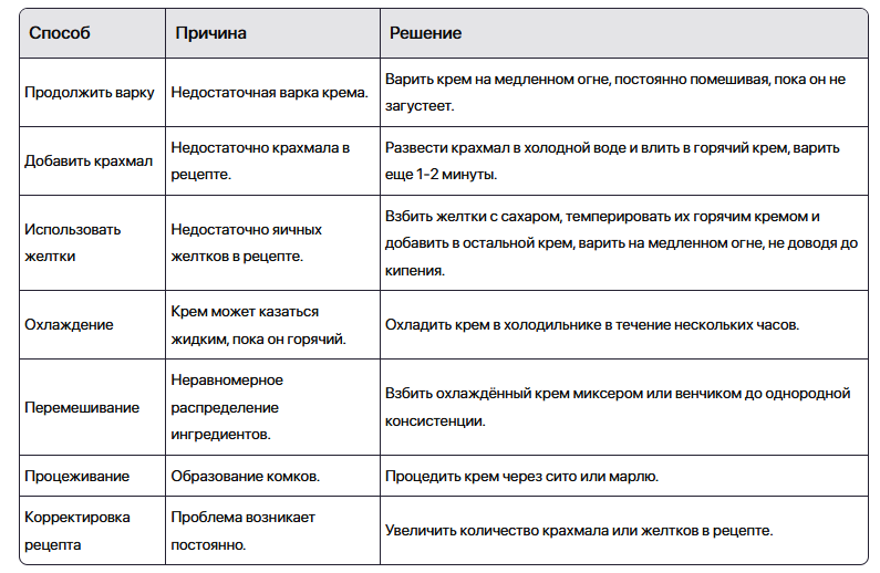 Вот таблица с кратким описанием способов исправления жидкого заварного крема: