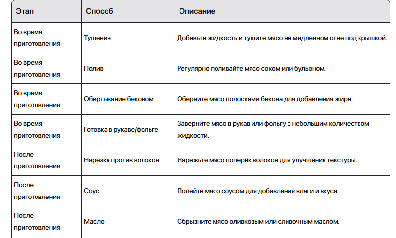 Вот таблица с кратким описанием способов исправления сухого мяса: