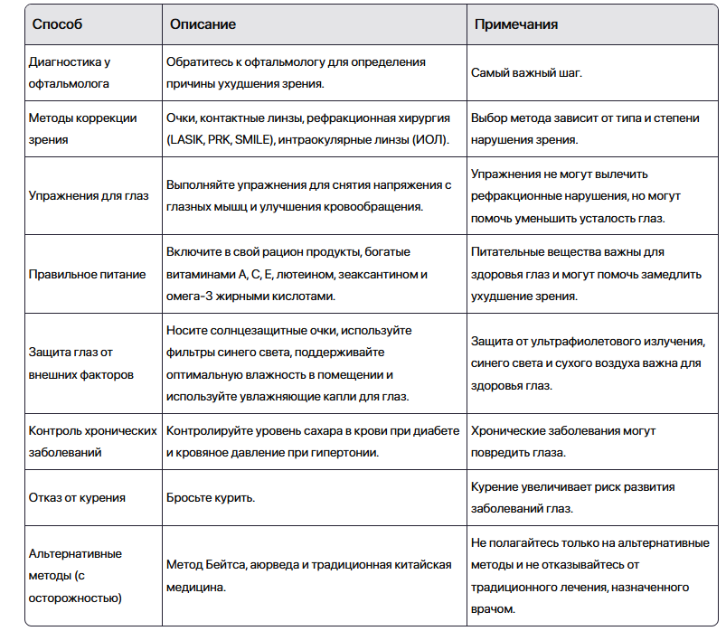 Улучшение зрения — это сложный вопрос, и возможности зависят от причины ухудшения зрения. Важно понимать, что не все проблемы со зрением можно исправить, и некоторые требуют медицинского вмешательства. Тем не менее, существуют различные способы улучшить зрение или замедлить его ухудшение. Вот таблица с кратким описанием способов исправления зрения: Важно помнить, что зрение — это ценный дар, и забота о глазах должна быть приоритетом. Регулярные визиты к офтальмологу, здоровый образ жизни и правильный уход за глазами помогут сохранить зрение на долгие годы.