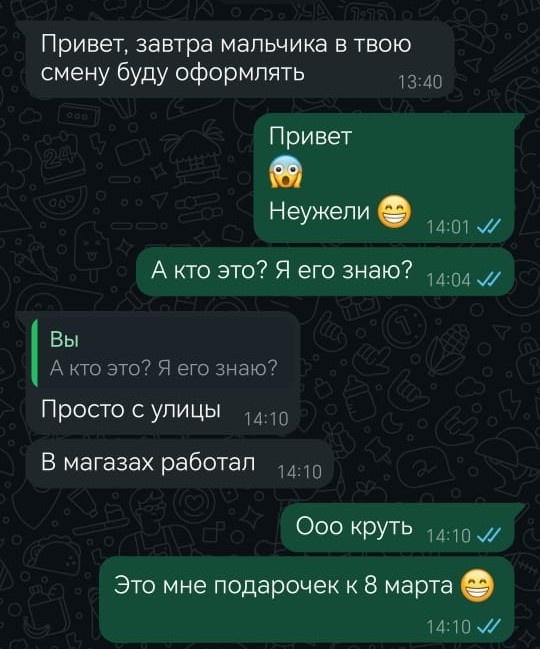 Но 4 марта мне написала директор моего магазина, что у меня в смене появится мальчик и выйдет он в смену сегодня! То есть, 8-го марта, если вдруг читаете эту статью не 8-го.