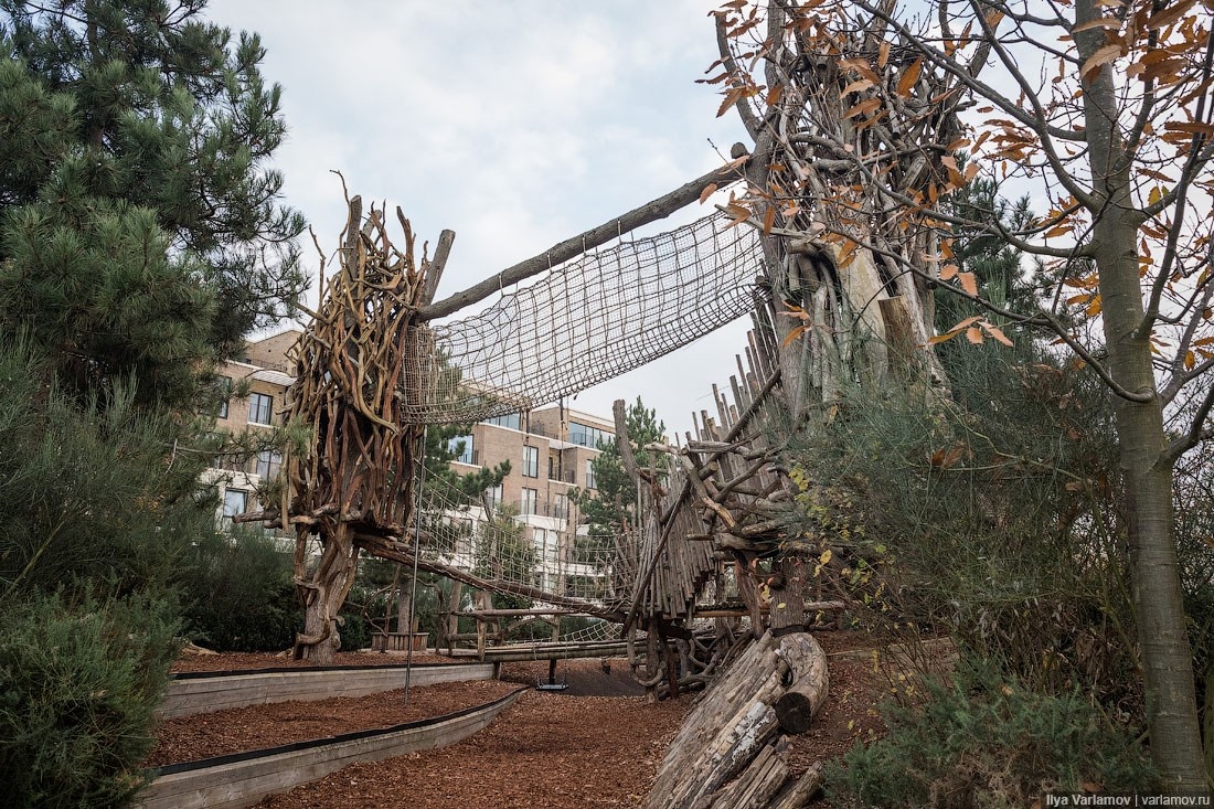 07. Проектировщики детской площадки (LUC и Erect Architecture) решили, что её "наполнение" должно базироваться на естественном ландшафте парка: "Мы хотели обеспечить детям возможность играть в природной среде, которая побуждает их экспериментировать". Как и на любой современной детской площадке, здесь может найти себе занятие ребёнок любого возраста.