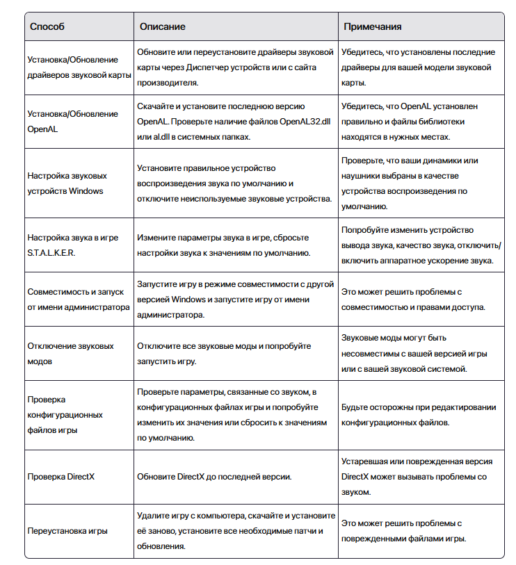 Вот таблица с кратким описанием способов исправления ошибки "OpenAL: Can't create sound device" в S.T.A.L.K.E.R.:
