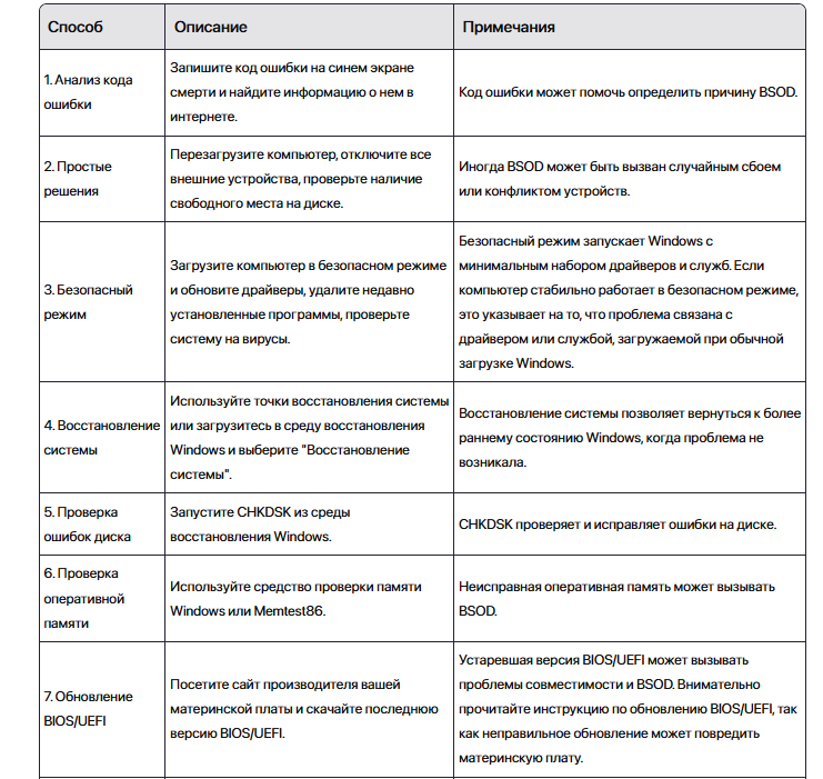 Вот таблица с кратким описанием способов исправления ошибки "На вашем ПК возникла проблема и его необходимо перезагрузить" в Windows 10: