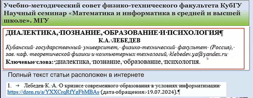Доклад на Научном семинаре «Математика и информатика в средней и высшей школе»