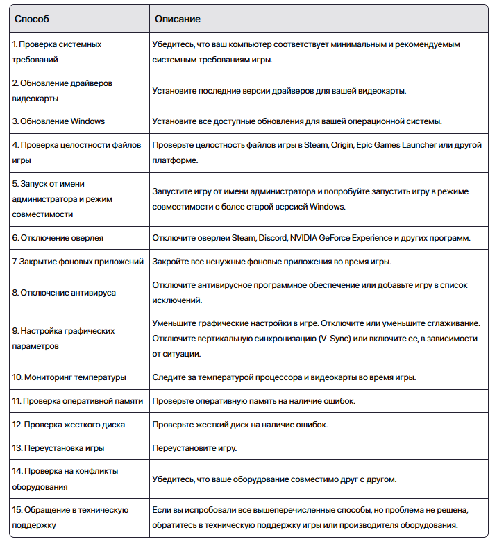 Вот таблица с кратким описанием способов исправления вылетов в играх:
