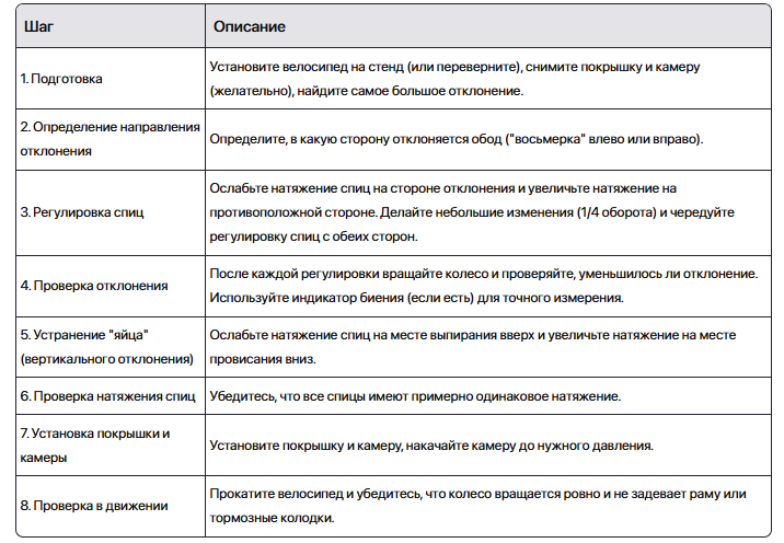 Вот таблица с кратким описанием шагов по исправлению "восьмерки" на колесе велосипеда: