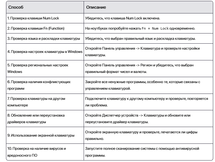 Если вместо цифр при наборе текста печатаются символы, это обычно связано с включенным режимом Num Lock или с неправильными настройками языка и клавиатуры. Вот несколько способов исправить эту проблему: Вот таблица с кратким описанием способов исправления проблемы, когда вместо цифр печатаются символы: