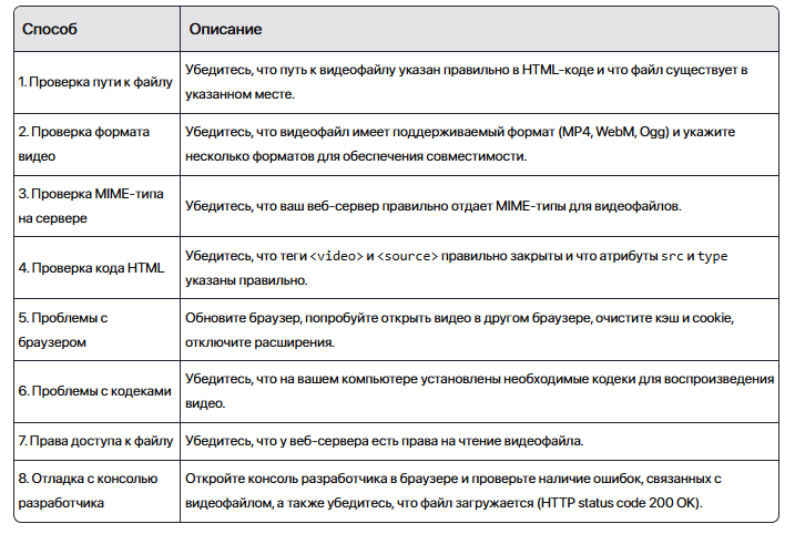 Вот таблица с кратким описанием способов исправления ошибки "HTML5 video file not found":