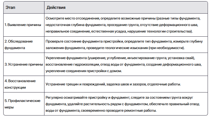 Вот таблица с кратким описанием действий по исправлению отрыва пристройки от дома: