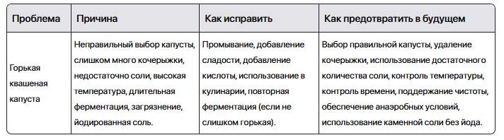 Вот таблица с кратким описанием способов исправления и предотвращения горечи в квашеной капусте:
