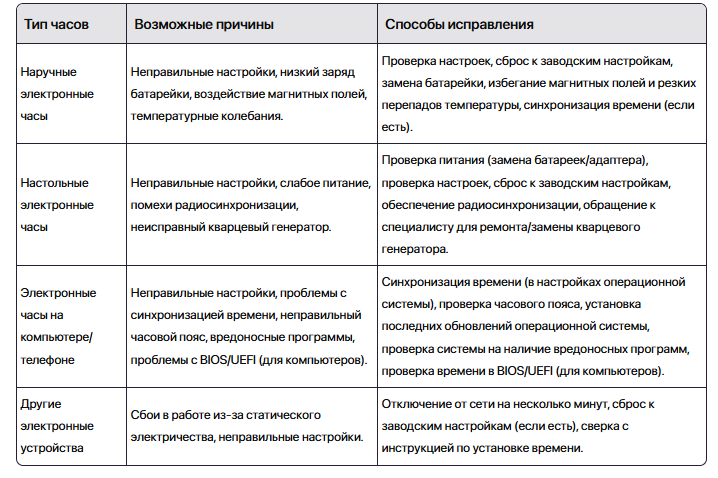 Вот таблица с кратким описанием способов исправления проблемы, когда спешат электронные часы: