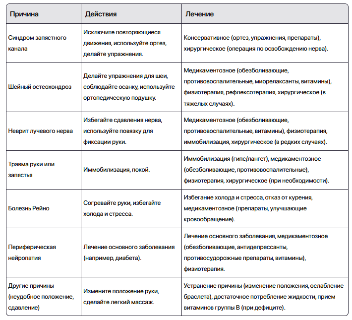 Вот таблица с кратким описанием причин, действий и лечения онемения большого пальца правой руки: