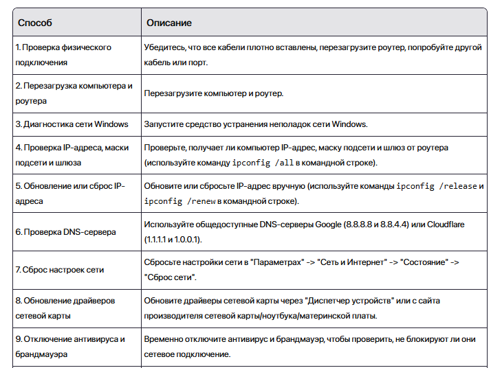 Сообщение "Подключено без доступа к интернету" означает, что ваш компьютер подключен к сети Wi-Fi или Ethernet, но не может получить доступ к Интернету. Это распространенная проблема, которая может быть вызвана различными причинами. Вот несколько способов диагностики и исправления этой проблемы: Вот таблица с кратким описанием способов исправления проблемы "Подключено без доступа к интернету":
