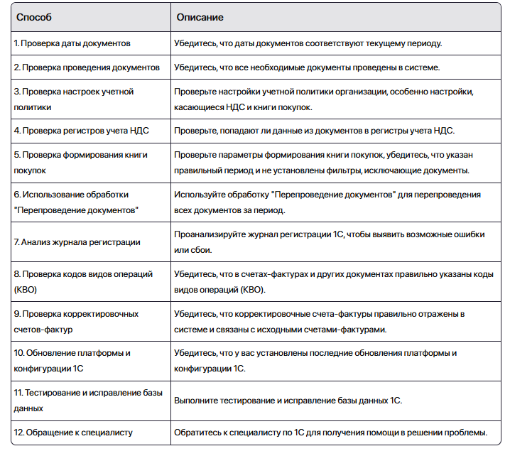 Вот таблица с кратким описанием способов исправления проблемы, когда документы не отражены в книге покупок и перенесены на следующий период в 1С: