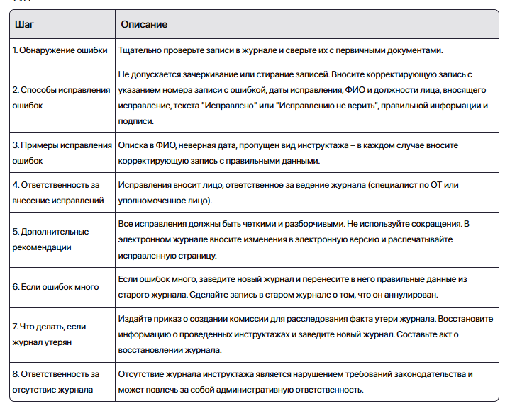 Вот таблица с кратким описанием действий по исправлению ошибок в журнале инструктажа по охране труда: