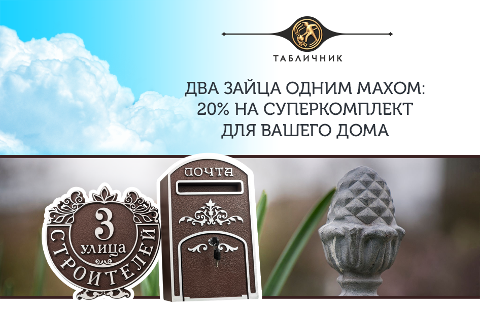 Источник фонового фото на баннере: GettyImages Вы когда-нибудь задумывались, что за каждым забором и фасадом живут уникальные люди? У каждого свои истории, интересы, мнения и причуды – а вот дома зачастую выглядят однотипно. Как же выделиться среди множества безликих фасадов? Наш ответ – детали решают всё! Большинству людей кажется, что аксессуары – какая-то мелочь, которой можно пренебречь. Но ведь это самый простой и доступный способ добавить дому индивидуальности! А теперь всё стало ещё проще: при заказе адресной таблички и уличного почтового ящика на частный дом вы получаете скидку 20% на весь комплект! Причём она суммируется с другими акциями на таблички и ящики. В нашем каталоге – 7 металлических почтовых ящиков и более 40 адресных табличек в 9 разных стилях. Найдутся роскошные авторские дизайны на любой вкус и настроение! Почему мы не предлагаем готовые комплекты? Потому что не хотим вас ни в чём ограничивать! Не существует правильных и неправильных сочетаний – только ваше лично