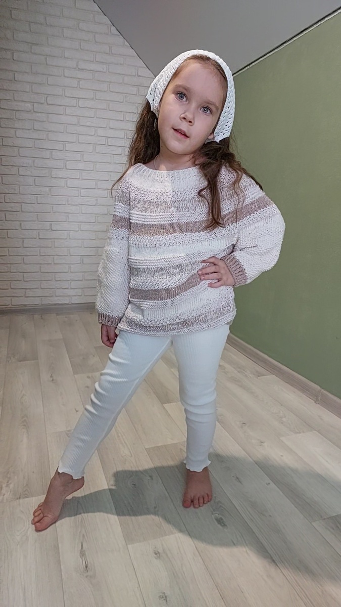 Описание представлено на рост 110-116 Круглая кокетка, азиатский росток Ход работы В работе я использовала бобинную пряжу разных оттенков 50 гр. 280 м. и пряжу фантазийную с шишечками 100 гр. 800 м, вязала в 3 нитки 2 нити бобинной и 1 нитка фантазийной. Спицы 4 Вяжу образец Плотность в 10 см. 20 п и 32 ряда, в 1 см 2 петли и 3,2 ряда образец вяжу тем рисунком которым планирую вязать кофточку. Кофточку вяжу по кругу, без швов, круглая кокетка, азиатский росток. Сокращение М означает маркер начало ряда. Меняем цвет и рисунок через каждые 8 рядов Рисунок можно любой , я чередую три рисунка: лицевая гладь, рис, и платочная вязка. Количество петель считаю следующим образом: измеряю голову у меня голова 53 см, перевожу в петли для этого получившуюся величину у меня 53 см умножаю на плотность петель в 1 см. У меня 2 п 53×2=106 петель, вычитаем 10% на растяжение 106-10%=95,4 если число получается не четное и не целое, то округляем до целого четного числа. Я округляю до 96 петель. Таким