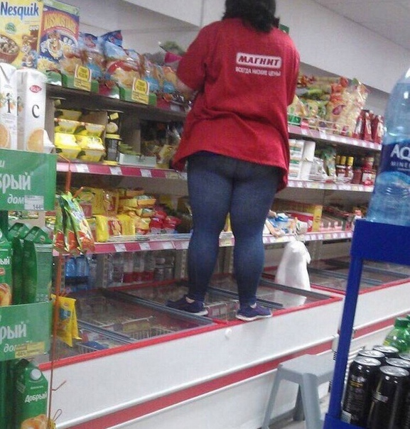 В наших супермаркетах работают бесстрашные и уверенные в себе продавцы... Сразу вспоминается... Коня на скаку остановит и на холодильник залезет и огромную сумку домой донесет))