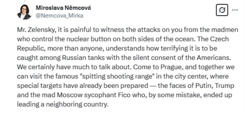 Депутат парламента Чехии пригласила Зеленского «поплеваться» в портреты его обидчиков... Небезызвестная Мирослава Немцова,ранее призывавшая «повторить Ленинград» решила не останавливаться на достигнутом абсурде и пошла дальше. Немцова написала, что ей «больно видеть нападки от сумасшедших обладателей ядерной кнопки по обе стороны океана». На этом фоне депутат обратилась к «диктатору справедливости» с предложением посетить Прагу и вместе с ней отправиться в «плевательный тир» в центре города, где уже якобы подготовлены специальные мишени в виде лиц Трампа, Путина и Фицо. Европейская помощь выходит на новый уровень... Всему свое время... Ваш Таксист...
