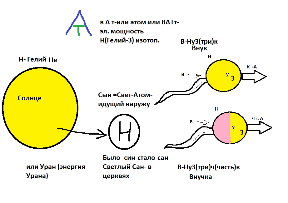 Итак, из Солнца(ОТЕЦ) вылетает изотоп гелия, солнечный свет (СИН-сынок) Н3(почему не Не? Потому что запись была русскими буквами и английское Не мы читаем как-Не, где е как...електронов, енергии?). И вот значит летит и долетает до АТОМА(зЕмля) и рождаются ЛЮДО-МЫсли-( Дух солнца)- материальный. ЗЕМля- Три Е(энергии изотопа)-Материализуются Людаа-Явного (ЛЮд-Люд Юдоли Дверь). То есть эта энергия на Земле помогает материализоваться мысли. Мы двери мыслей Солнца ). Мы явные материальные мысли Солнца!!!! Мы Искры нашего Солнца внутри нас же. Наш мозг Искрит созданием МЫсли (МЫ- Мысли Двери), проецируем мысли в материю. 3глав-ТриГлав, Глава-глаза-глас- мысль в голове, рот-слова- материя-видеть материю.