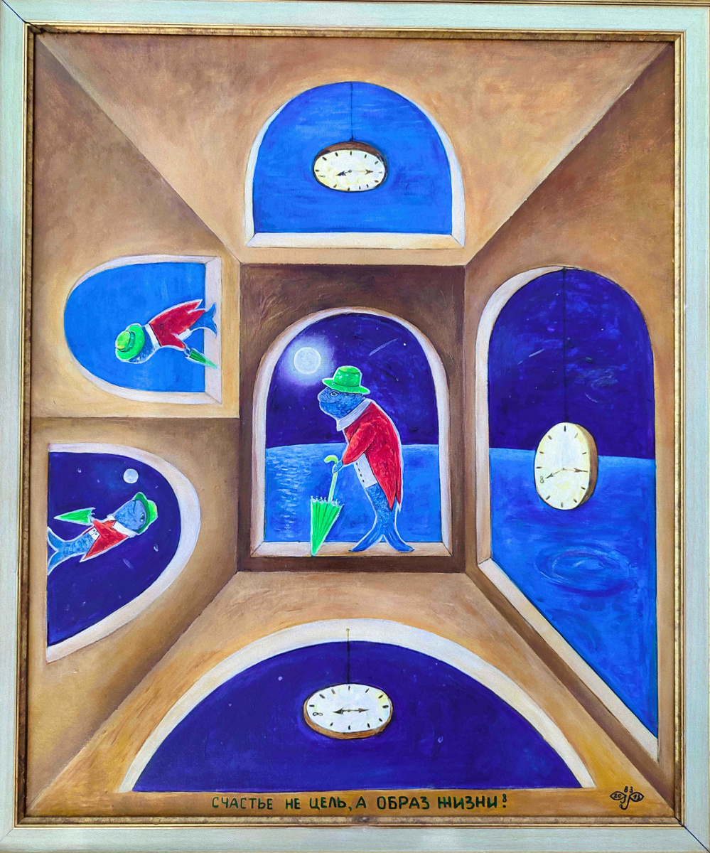 Между восемью часами вечера и первым лучом рассвета скрывается больше тайн, чем во всех библиотеках мира. И только тот, кто умеет видеть красоту в простых вещах, может их открыть. 8 марта на восьмой час вечности выходит рыба-Сан в красном смокинге и кислотно-зеленой шляпе, сверкая как перламутровый закат над Невой. Пространство вокруг него перетекает из одного измерения в другое, словно выбирая подходящий ракурс для солнечного настроения. В одной руке он держит - перламутрово-зеленый зонт, самый главный аксессуар для дождливого и серого Петербурга, его родного города. В другой руке у него - маленькая звезда, которую он купил у продавца облаков на рынке Грез. Звезда, словно искра из сердца комет, наполнялась светом с каждым его шагом, проливаясь через края ночного бокала и оставляя на её поверхности тонкие кружева надежды. "Знаете?!" - говорит он продавцу, протирая очки, которые он никогда не носит, -"эта звезда будет моим путеводителем." Продавец улыбается: "А куда вы собираетесь,