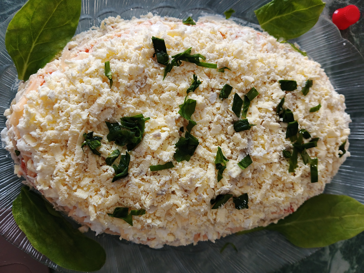 Ингредиенты: Отварить овощи и яйца , остудить и почистить. Лук порезать мелко , с рыбы убрать косточки и слить жидкость , смешать лук и рыбу вместе . Собираем салат : 1 слой рыба с луком , смазать майонезом. 2 слой натереть на тёрке картошку, смазать майонезом. 3 слой морковь натереть на тёрке и так же смазать майонезом. 4 слой сыр натёртый , майонезом не смазываю. 5 слой яйца ( белок) натёртые , смазать майонезом 6 слой желтки протертые , посыпать зеленью.