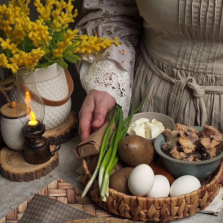 Салат «Мимоза» стал символом 8 Марта благодаря своей нежности и воздушности. По одной из версий этот салат был впервые придуман в Абхазии в середине 60-х годов, когда по городу разливался аромат цветущей мимозы. Новое блюдо произвело фурор среди отдыхающих женщин, которые попросили рецепт и увезли его с собой. Постепенно салат стал популярным по всей стране и его начали готовить на праздники, особенно на 8 Марта и Новый год. Нам понадобится: Консервы открыть,слить сок, рыбу переложить в отдельную посуду,туда же сразу добавить сливочный сыр, мелко нарезанный зелёный лук и сухой чеснок и размять все вилкой до равномерного распределения сыра. Можно и не добавлять сыр,или добавить майонез сразу в рыбу, но я не любитель майонеза в больших количествах и стараюсь минимизировать его использование, к тому же, со сливочным сыром получается вкуснее,на мой взгляд. Картофель,морковь и яйца отварить. Охладить до комнатной температуры. Картофель натереть на средней или крупной тёрке. Подготовить