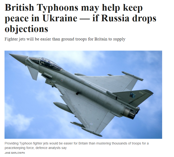 Согласно последним данным, Великобритания готовится направить истребители Typhoon для поддержки будущей воздушной полицейской миссии. Предложение появилось сразу после того, как лидеры нескольких европейских стран встретились, чтобы обсудить возможность отправки войск для поддержки мирного соглашения. Сама идея миссии была обсуждена в британском правительстве, при этом подчеркивается, что для реализации такого проекта потребуется большое количество воздушных судов, а также наземных систем противовоздушной обороны для защиты самолетов на земле.