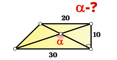 1. В прямоугольной трапеции с основаниями 20 и 30 и высотой 10 найдите больший угол между диагоналями трапеции.