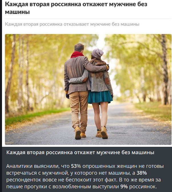 Я не придумала эту "машинную" философию с потолка. Недавно аналитики CDEK.Shopping провели опрос, и цифры говорят сами за себя: 53% россиянок, включая меня, откажут парню без автомобиля. Ещё 38% сказали, что им всё равно, а 9% романтичных душ готовы топать ножками рядом с любимым. Но я не из тех, кто будет месить грязь в новых кроссовках ради "душевных разговоров".