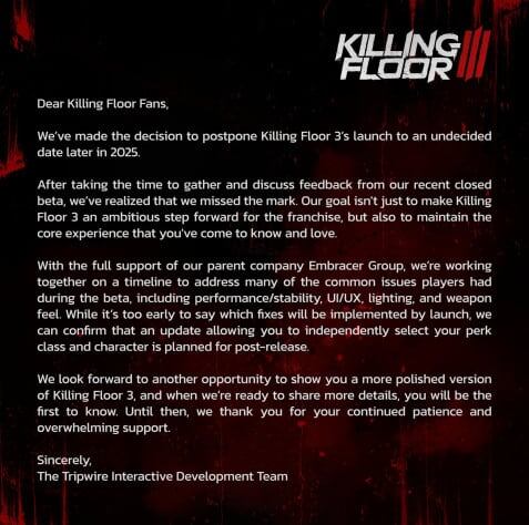 Студия Tripwire Interactive планировала релиз мясного шутера Killing Floor 3 уже 25 марта, однако разработчики решили перенести запуск на несколько месяцев из-за не самых удачных результатов закрытого бета-тестирования. Теперь старт намечен на 2025 год без точной даты. Дорогие фанаты Killing Floor, мы приняли решение отложить запуск Killing Floor 3 на неопределённую дату в 2025 году.