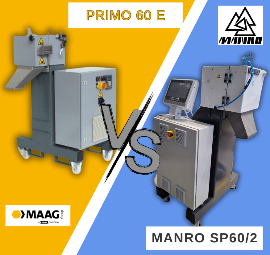 Современное производство компаундов и переработка пластмасс требуют надежных решений для грануляции. Сегодня рассмотрим две модели: Maag Primo 60 E – признанный представитель немецкого производства и MANRO SP60/2 – его российский аналог, новое имя на рынке экструзионного оборудования. Maag Primo 60 E Maag давно известен в мире экструзии и Primo 60 E – это добротный европейский гранулятор, разработанный для работы в составе экструзионных линий. Он прост в эксплуатации, компактен и надежен, однако конструктивные решения в нем не лишены спорных моментов. Конструкция и особенности Ширина рабочей зоны – 60 мм Привод – один двигатель (2,2 кВт), который приводит в движение и режущую фрезу, и затяжной ролик Скорость работы – 20-90 м/мин Количество стренг (при 50% загрузке) – 10 Сильные стороны Компактность – занимает минимум места в производственной зоне Стабильность работы – проверенная конструкция, используемая на многих предприятиях Качество сборки – высокие стандарты производства Особеннос