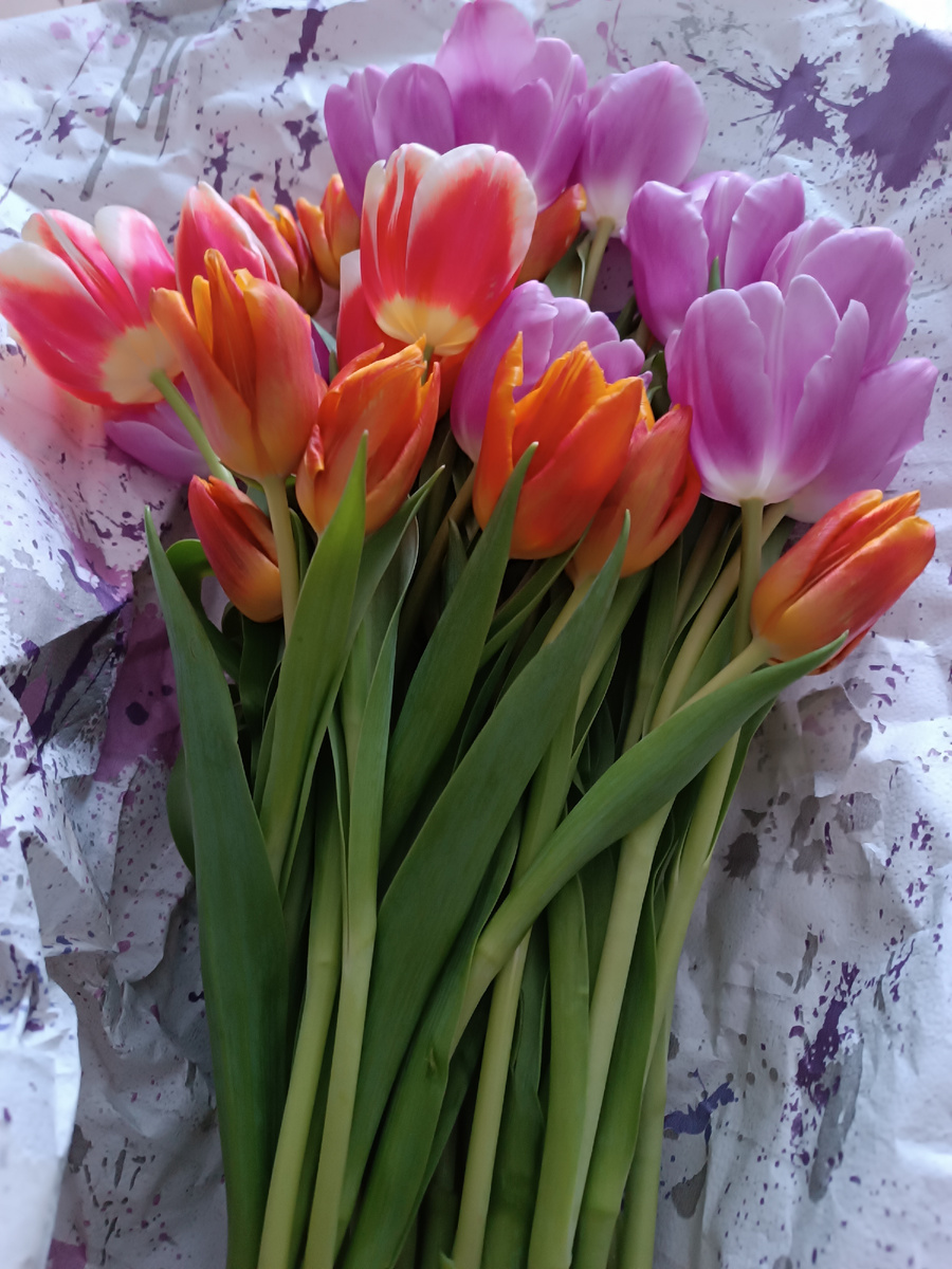 Всем привет. С праздником красотки 💐. Всем счастья, здоровья и благополучия! Как настроение? У меня весеннее. С утра, сын прибежал с охапкой тюльпанов. Просто, обычные тюльпаны, не сами цветы меня радуют, а именно внимание. Накануне только, на работе слышала разговоры, что тюльпаны то мол по 200 рублей за один цветок продают. Цены, цены, цены. Ох уж эти цены. В обычный какой то кусок обоев или обой😁, завернуты, но так мило. Не знаю, как всем такая композиция, а у меня глаз радуется)) Я сегодня ничего не делаю. Чуть позже приведу себя в порядок. Накроем стол, придёт мама. Я заказывала себе в подарок форму для духовки. С крышкой. Сын вчера пошёл забирать заказ в пункт выдачи. Озон. А там только крышка 😐. Самой формы нет. Ну думаю всё, осталась я без подарка. Ан нет, робота заказывала ещё. Игрушка мне вручена. Буду баловаться. Пока что сей агрегат надо изучить. Муж уже побаловался, на зеркале. Я ещё ничего не поняла, что с ним надо делать. Про страховочный трос только поняла😁. С пр