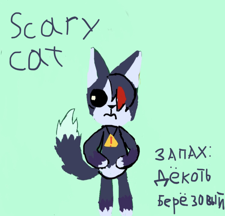 Это Scary cat, интересный персонаж, но очень пугливый! С этим персонажем высокая психика! Когда он видео что-то страшное или что-то происходит опасное то он начинает орать! С начала он сдерживает чтобы не начать истерику! Но он не сдерживает! Он даже руками рот прикрывает чтобы не за орать! Но даже это не помогает! Он начинает орать! Его можно успокоить только если его обнять! Все улыбашки считают что скэри-Кэт монстр! На самом деле он хороший! Просто его крик страшный! Его может успокоить только кристаллик Линкс! а причина из-за которого эту игрушку убрали с продажи так это громкий крик этой игрушки! Дети во сне случайно дёргали его за хвост! А его хвост это активатор самого звука! Дети от этого просыпались и вырубали его, это повторялось несколько раз за одну ночь! И самый плохой минус это из-за того что этот звук у детей барабанные перепонки лопал! Дети становились глухими! Чтобы этого не повторялось, игрушку сому убрали! а запах этой улыбашки: берёзовый дёготь.