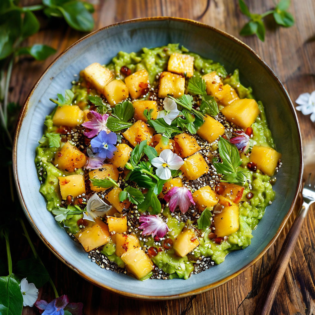 Ингредиенты: Для тартар: Авокадо – 1 шт. (спелое) Дыня – 200 г (желательно сладкая, можно использовать канталупу или медовую дыню) Лайм – 1 шт. (сок и цедра) Оливковое масло – 1 ст. ложка Соль – по вкусу Перец черный молотый – по вкусу Свежая мята – несколько листиков (по желанию, для украшения) Для подачи: Семена чиа – 1-2 ст. ложки Съедобные цветы (например, настурция или фиалки) – для украшения (по желанию) Приготовление: Подготовка ингредиентов: Авокадо разрезать пополам, удалить косточку и ложкой вынуть мякоть. Нарезать кубиками. Дыню очистить от кожуры и семян, нарезать кубиками аналогичного размера. Смешивание ингредиентов: В миске аккуратно смешайте кубики авокадо и дыни. Добавьте сок и цедру лайма, оливковое масло, соль и черный перец. Аккуратно перемешайте, чтобы не повредить кубики авокадо. Приготовление семян чиа: Если хотите, можно предварительно замочить семена чиа в небольшом количестве воды на 10-15 минут, чтобы они немного разбухли и стали более желеобразными. Подача: