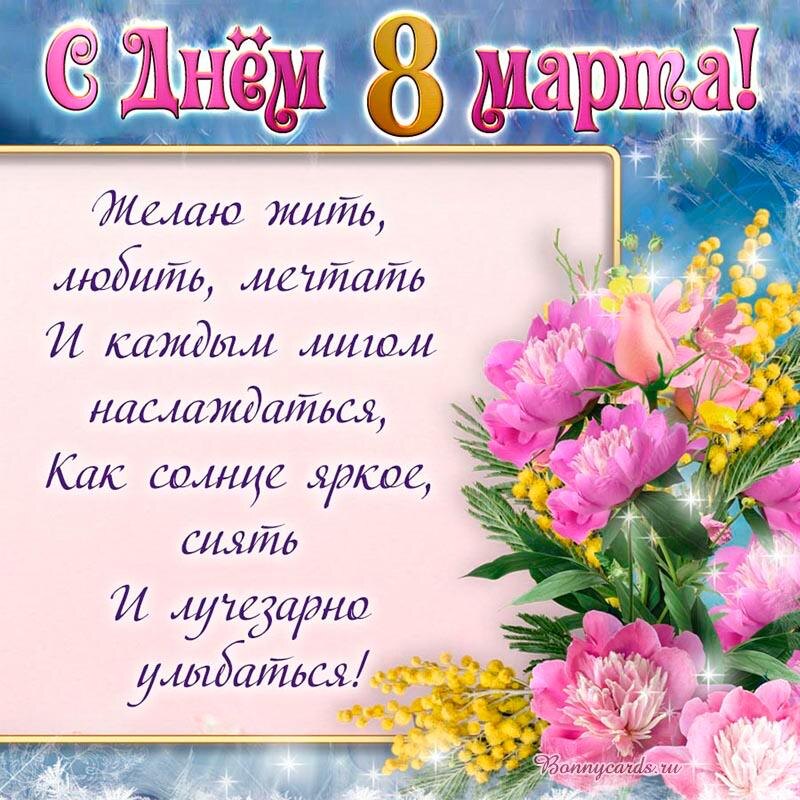 Сегодня, в этот прекрасный день 8 Марта, я хочу поздравить вас нежные и милые девушки с праздником весны, красоты и любви! Мы– настоящие чудеса природы, которые дарят радость и тепло. Наша красота и нежность заставляют сердца мужчин биться чаще, а наша мудрость и сила духа вдохновляют их на подвиги и достижения. Желаю вам, дорогие женщины, чтобы каждый день был наполнен яркими эмоциями, любовью и заботой близких. Пусть ваши мечты сбываются, а жизнь приносит только приятные сюрпризы. Пусть ваши сердца всегда будут наполнены радостью, а души – светом и теплом. С праздником, дорогие женщины! Будьте счастливы и любимы!