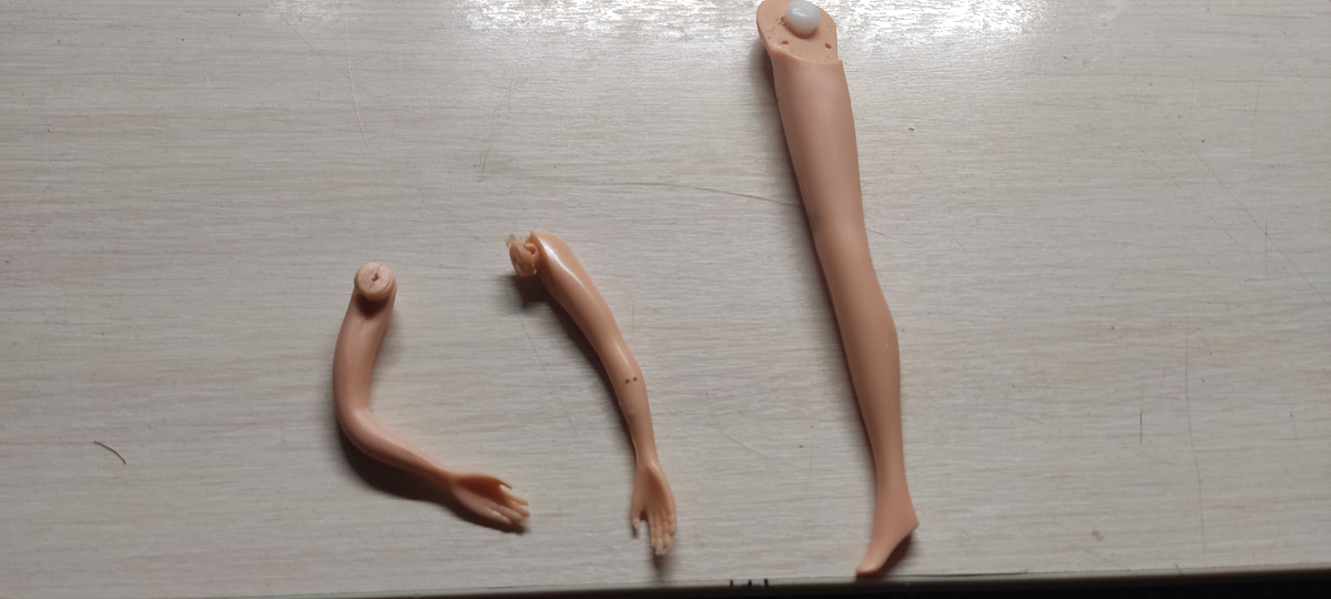 Как я уже писала ранее, хочу восстановить двух девочек из детства. Оказалось (благодаря знатокам - сохоббитам), что это Синди. Главная проблема у неё была в сломанном пополам теле. Так как найти родное (или хотя бы приблизительное) тело от Синди довольно дорого для меня, я решила воспользоваться схожим телом от Барби. Пересаживать её на современное МТМ-тело не стала, т. к. у неё голова совсем жёлтая от времени. У этого тела ноги сгибаются на щелчки, а руки дубовые. От родного тела остались правая нога и руки, которые гнутся. Хотела заменить, но у нового тела отверстия для рук больше. Буду думать, как соединить несоединимое. И благодарна, если с вашими советами получится сделать это. И ещё у неё, как и у многих недорогих кукол, оказалась прошивка под хвост и редкие волосы. Поэтому я, вспомнив, что от эльфийского принца у меня остались серебряные трессы, проклеила ими голову и свои пальцы. Предварительно я вымыла и вычесала родные волосы, остригла колтуны на концах, и подровняла их