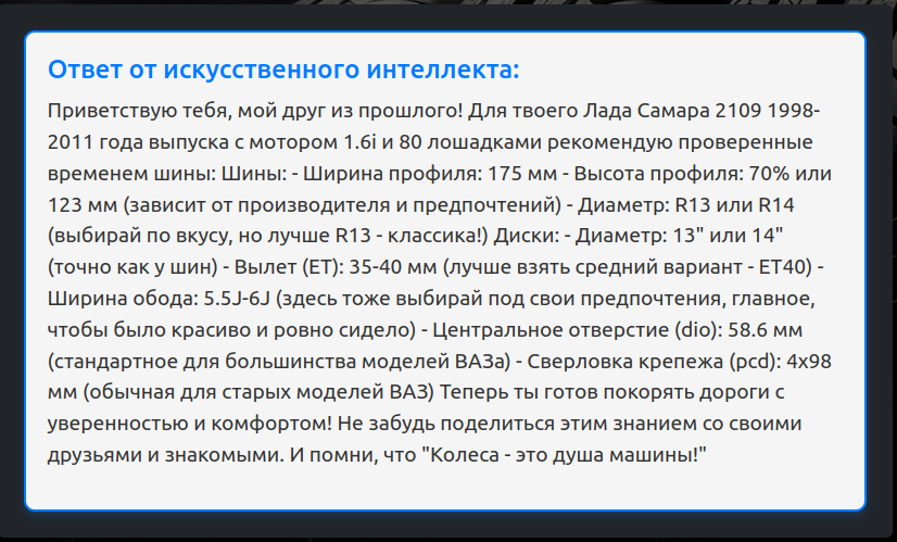 Интеграция Искусственного Интеллекта в CRM для Учета и Продажи Шин и Дисков: Наш Путь к Будущему 2025 год — это время, когда искусственный интеллект становится неотъемлемой частью нашей жизни. Мы видим, как технологии ИИ проникли в самые разные сферы: от медицины и финансов до ритейла и транспорта. Искусственный интеллект не просто ускоряет процессы, но и делает их более точными, удобными и, что немаловажно, персонализированными. И вот, в эпоху ИИ, пришло и наше время. ИИ в Wheels-Point: Революция в мире шин и дисков Мы — команда разработчиков и специалистов, создавших CRM-систему для учета и продажи шин и дисков — долго думали, как можно интегрировать искусственный интеллект в наш проект. Мы знали, что ИИ способен не только автоматизировать рутинные задачи, но и существенно повысить точность подбора, улучшить клиентский опыт и сократить время на поиски нужных товаров. И вот, мы приняли решение: подключить ИИ к нашему справочнику по подбору шин и дисков для автомобилей. Почему именно