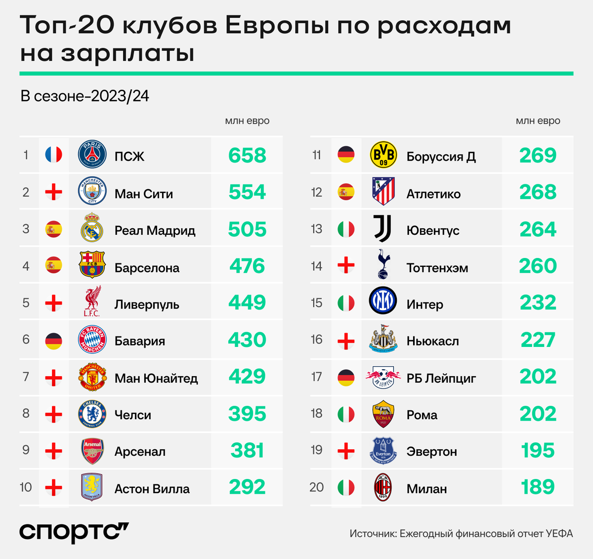 Вот так выглядит топ-20 европейских клубов, которые платят сотрудникам (не только футболистам, но и тренерам, и простым работникам) больше остальных.